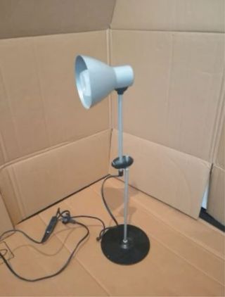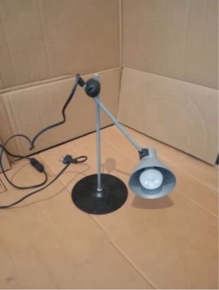 Lamparita de mesa de escritorio. Color gris, metálica. Brazo regulable para altura y dirección. Tiene un pequeño desperfecto en el botón de encendido que está solucionado con un poco de cinta. No afecta al funcionamiento. **Bombilla LED incluida en el precio**