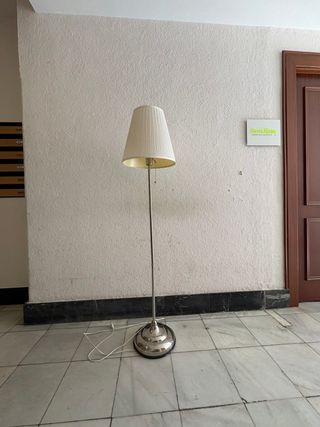 Lámpara de pie de Ikea con un diseño moderno y elegante. - Pantalla de tela en tono beige. - Base y pie de metal en acabado plateado. - Iluminación cálida y acogedora.