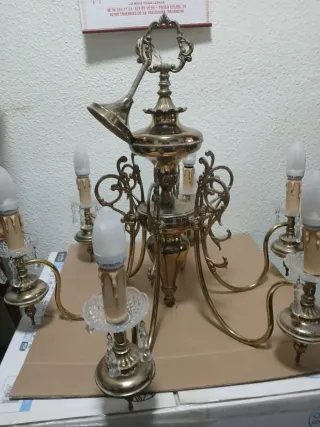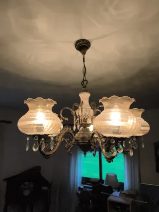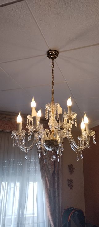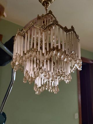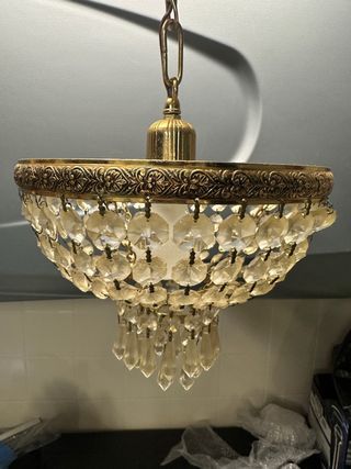 Elegante lámpara de techo de araña con lágrimas de cristal. Requiere recolocar algunos cristales, no falta ninguno. Medidas aproximadas 60 cm alto x 58 cm ancho. Se entrega en Madrid, zona Príncipe Pío.