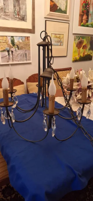Elegante lámpara de techo de estilo clásico, con un diseño de metal oscuro y detalles de cristales colgantes. - Estructura de metal negro. - Incorpora 5 tulipas con forma de vela. - Adornada con lágrimas de cristal tallado. medidas: 60 cm de Diametro y alto 60 cm .. Precio 50€