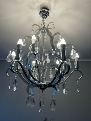 Elegante lámpara de araña con un diseño clásico y detalles de lágrimas. - Acabado en color negro. - Fabricada con metal y plastico.