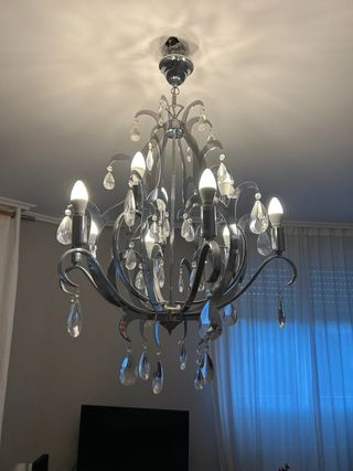 Elegante lámpara de araña con un diseño clásico y detalles brillantes. - Estructura principal en metal plateado. - Colgantes de cristal transparente en forma de lágrima. - Adornos circulares de cristal incrustados en la estructura.