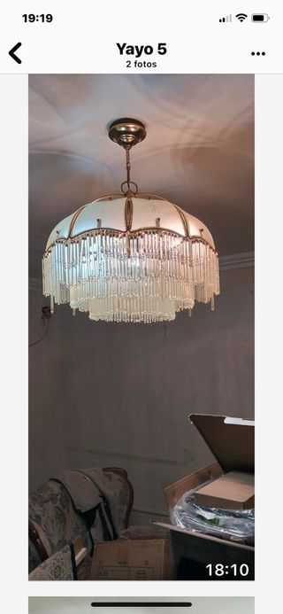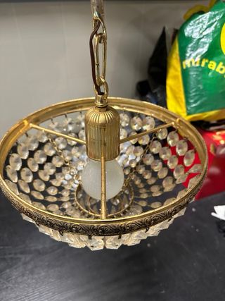 Preciosa lámpara de techo con un diseño vintage. - Estructura metálica dorada. - Cuentas de cristal transparentes. - Cadena para colgar. Vendo preciosa lámpara de techo estilo vintage / mid-century, con estructura metálica en tono dorado y lágrimas/tubos de cristal transparente que crean una luz cálida y muy acogedora. Es una pieza muy decorativa, ideal para: • Salón • Dormitorio • Recibidor • Comedor o para dar un toque especial a cualquier estancia. 💡 Con la luz encendida crea un efecto precioso, y apagada es un elemento decorativo por sí sola. 🪞 El cristal y el dorado aportan elegancia sin recargar el espacio.