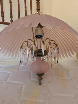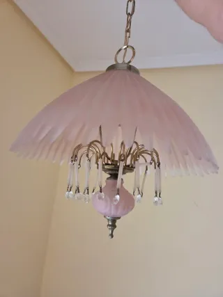 Elegante lámpara de techo con un diseño delicado y detalles colgantes. - Pantalla principal en tono rosa translúcido. - Estructura y cadena en acabado dorado. - Adornos de cristal facetado. - Detalle central en forma de lágrima rosa. Vintage años 80
