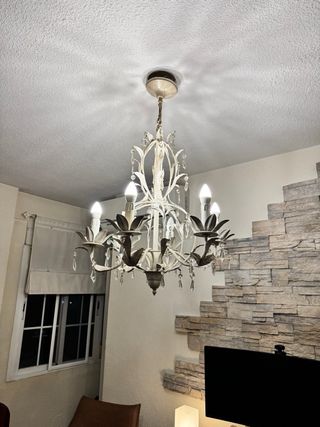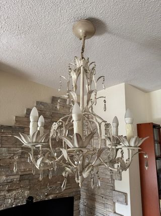 Lámpara de araña con un diseño vintage. Es de color blanco roto y está fabricada en hierro forjado. Detalles hojas y lagrimas de cristal. - Tiene 6 brazos - Incluye 6 bombillas tipo vela de bajo consumo - Altura 85 cm - Diámetro en su parte más ancha 55 cm Solo venta en persona en Madrid.