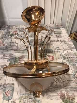 Elegante lámpara de techo de bronce con un diseño de lágrimas de cristales tallados transparentes que refractan la luz formando destellos tornasolados. 🔎Mirad las fotos para entender su estado. ❌No acepto devoluciones ni pagos con Bizum. Sólo efectivo.