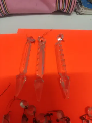 575 lagimas.Lote de lágrimas de cristal para lámpara de araña.Contadas a peso. Son piezas decorativas que aportan brillo y elegancia.Hay ganchos de unión.N 1. - Material: Cristal. - Diseño: Lágrimas facetadas.