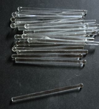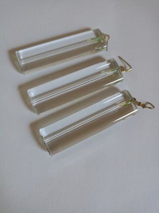 Tubitos de cristal transparente con pequeña gota al final. No tienen orificios para enganchar anillas. Tienen que sujetarse con un capuchón. Medidas en las fotos. Las imágenes forman parte de la descripción. Sueltas a 0.80€. No hago envíos por menos de 5€. Si el importe es menor, por favor pónganse en contacto conmigo. Hago lotes.