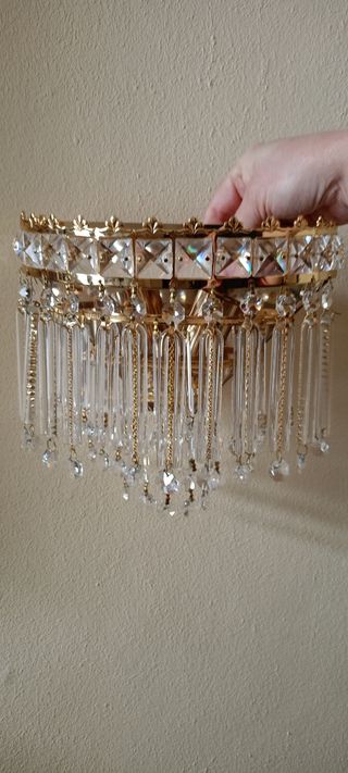 Tanto los cristalitos de Strass como el metal están en buen estado. 14 cm alto (placa trasera). Alto de frente 20cm teniendo en cuenta las lágrimas de cristal. 23 cm de ancho 9.5 cm de fondo Años 80. 2 portalámparas para bombilla rosca E14. 35€. Rebajado a 28€. Si les interesa tengo otro igual a éste.
