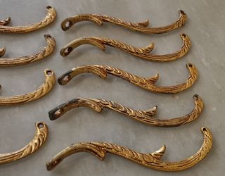 9 Cayadas de metal para lámpara. Brazos pequeños para colgar adornos en las lámparas. Las cayadas/brazos de adorno, tienen orificio para colgar flores o lágrimas. Medidas y detalles en las fotos. Las imágenes forman parte de la descripción. Años 80.