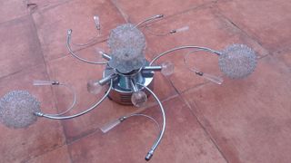 Elegante lámpara de techo con un diseño moderno y llamativo. Sus brazos curvos y detalles esféricos le dan un toque sofisticado. - Acabado plateado brillante. - Esferas decorativas de cristal. - Detalles en forma de lágrima. - Estructura metálica robusta.