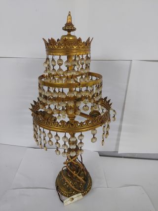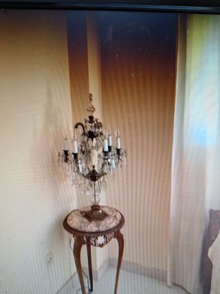 Lampara de sobremesa años 50. Mide 47 cm de altura. Como se ve le faltan bastantes 'lágrimas' que se pueden comprar todas nuevas facilmente. Con su cableado original y funcionando.