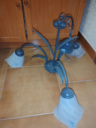 lampara techo de hierro forjado y tulipas de vidrio color naranja y azul marino