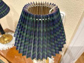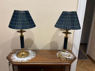 Lamparitas de mesita de noche. - Diseño clásico con base dorada. - Pantallas plisadas con estampado de cuadros verdes y azul marino - Cuerpo de la lámpara a juego pantalla en cuadros verdes y azul oscuro. 42cms de alto x 23cms es el max ancho de la base de la pantalla.