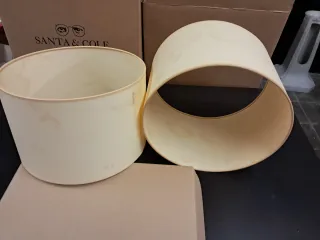 Dos pantallas para lámparas de Miquel Mila de la marca Santa & Cole. Nuevas en su caja pero con manchas de Agua. Medida diametro30 cm. Altura 20 cm.