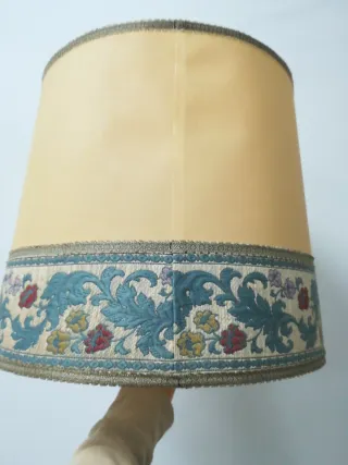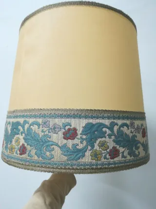 tulipa súper vintage para lámpara de mesa. Tela dorada con cenefas y franja ancha cosida con diseño vegetal. Interior plastificado Mide 41cm alto. Diámetro superior 38cm e inferior 45,5cm. Diámetro interno apoyo argolla 3,3cm Papiro seda crepe cable aplique techo araña cristal murano antiguo antigua antigüedad retro kartell pantalla Hollywood regency zara kave home becara Borgia conti dorado bronce vela pan oro globo corte inglés ikea cómoda lladro cantón limoges prismas candelabros espejo veneciano lumica space age Luis XV manises fase atrezo televisión pinza plisado gaston y Daniela gancedo kilo Americano oca bombilla luz pinza
