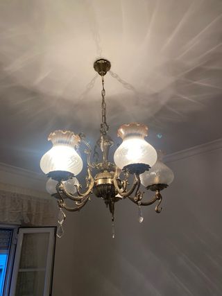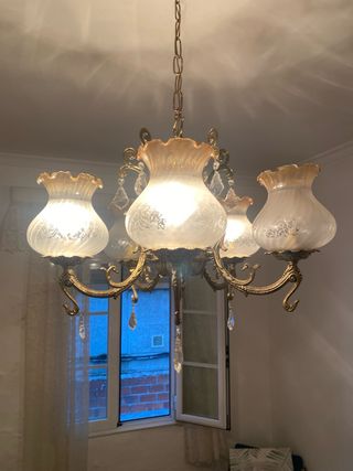Elegante lámpara de bronce con detalles de cristal,Diseño clásico y sofisticado,Acabado en tono dorado,Cristales transparentes que aportan brillo,es grande 6 brazos, más cosas en mi perfil.