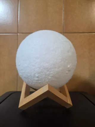 Lámpara decorativa con forma de luna, ideal para crear un ambiente acogedor. - Diseño esférico con textura (15 cm de diámetro) - Base de madera compuesta por tres piezas que se unen por medio de imanes. - Falta el cargador (era usb por un lado, y por el otro que conecta a la luna, mirar la foto). - Valió 20€ en Amazon aprox.