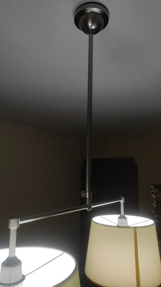 Elegante lámpara de salón extensible con dos tulipas, en dela para encima de la mesa del salón. Puede venderse sola o a juego con otra lámpara de una sola tulipa por 100€ Medidas las tulipas:30cm de diámetro max y altura de 19,5cm. Brazo horizontal 59cm