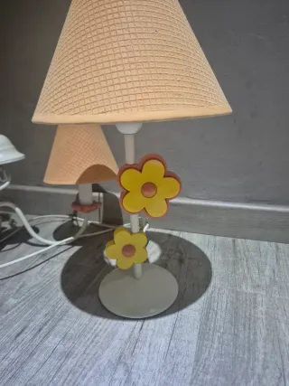 Conjunto de lámparas con un diseño infantil y alegre, decoradas con flores. - Lámpara de techo con cadena. - Lámpara de mesa con base. - Pantallas de tela con textura. - Adornos de flores de plástico.