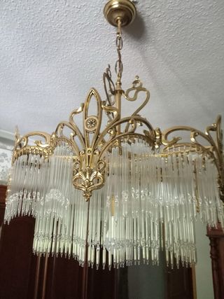 Elegante lámpara de techo con un diseño clásico y detalles ornamentales. - Estructura principal en metal dorado. - Múltiples tiras de cristales transparentes.