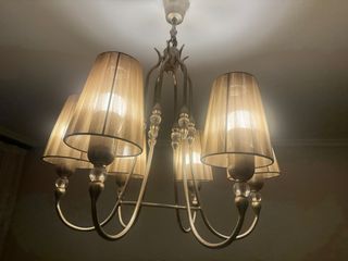 Elegante lámpara de techo con un diseño clásico y sofisticado. Perfecta para añadir un toque de calidez a cualquier estancia. A conjunto dos lámparas de mesita. - Acabado metálico en tono dorado. - Pantallas de tela en color beige. - Detalles de cristal. - Diseño de 5 brazos. Muy bien cuidadas.