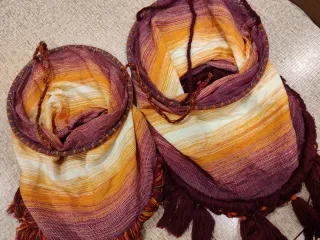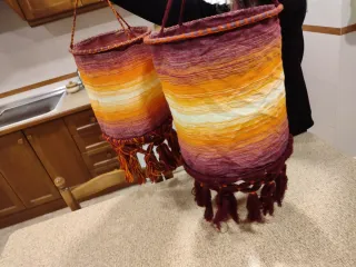 Conjunto de dos lámparas artesanales, inspiradas en el estilo de Chaouen. Cada lámpara presenta un diseño único con degradados de color. Sin usar, nuevas. De 24 y 29.5 cm de diámetro - De tela. - Tonos degradados de naranja y morado. - Adornadas con flecos y trenzados en la parte inferior.