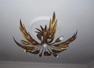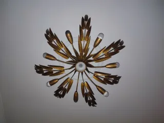 Preciosa lámpara vintage de los años 60 de la casa FERROART en metal dorado (pan de oro),compuesta de 7 brazos con hojas y otros 7 con las luces para bombillas E27. Todas estas ramas, se conectan en un solo tronco que se abre en seis grandes hojas que se adhieren al techo. Conserva todo el encanto de lo vintage y realizado de forma artesanal de la época.