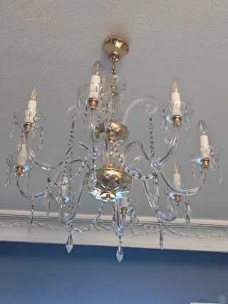 Elegantes lámparas de araña con un diseño clásico y detalles brillantes. - Estructura principal de bronce dorado. - Brazos y adornos de cristal transparente. Una tiene 8 brazos y la otra 12.Vendo por cambio de decoración.El precio es de las 2