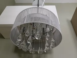 Elegante lámpara colgante con un diseño moderno y sofisticado. - Pantalla exterior de tela plateada. - Adornos de cristal en forma de lágrima. - Estructura interior metálica.