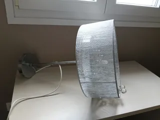 Lámpara de escritorio con un diseño moderno y funcional. Su acabado combina blanco y plateado, aportando un toque elegante a cualquier espacio. - Base estable. - Brazo articulado para dirigir la luz. - Pantalla con forma de campana. UNIDAD A 8€ LAS 3 POR 20€