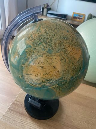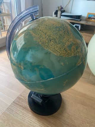 Globo terráqueo que funciona como lámpara. Ideal para decorar cualquier espacio. - Base negra. - Soporte transparente.