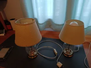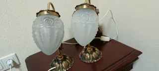 Conjunto de dos lámparas de mesita de noche con un diseño clásico y elegante. Más un globo de repuesto que conservo. - Base y detalles en acabado dorado. - Pantallas de cristal translúcido con relieve. - Estilo vintage.
