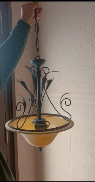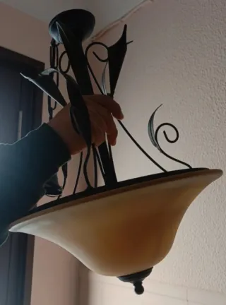 Lámpara de techo de estilo clásico, realizada en forja metálica con detalles decorativos y tulipa de cristal color ámbar. Aporta una luz cálida y muy acogedora, ideal para salón, comedor, dormitorio o recibidor. En buen estado y totalmente funcional. Diseño elegante y atemporal, perfecta para ambientes clásicos o rústicos. Se vende por cambio de decoración.