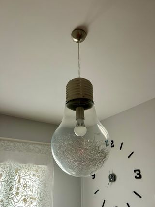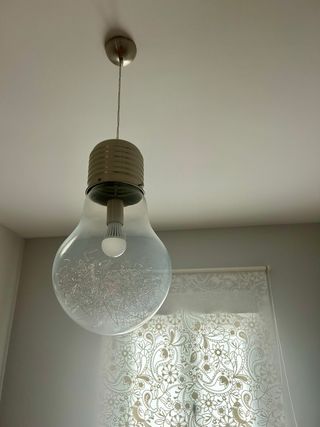 Lámpara colgante con un diseño original en forma de bombilla gigante. - Cuerpo de cristal transparente. - Base y detalles metálicos plateados. - Bombilla LED incluida.