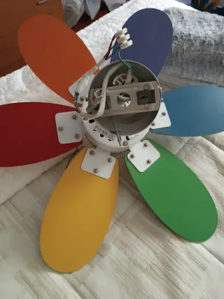 Lámpara ventilador con un diseño original y alegre, ideal para dar un toque de color a cualquier habitación. Se vende por falta de uso. - Aspas de diferentes colores pastel. - Bombilla central blanca. - Cadena para accionar la luz y el ventilador.