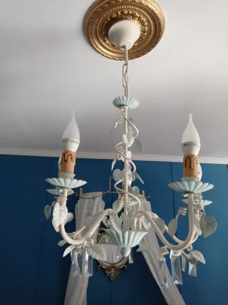 Elegante lámpara colgante con un diseño encantador. Aporta un toque de distinción a cualquier espacio. - Acabado en blanco y celeste - Detalles en forma de hojas y flores. - Cristales decorativos colgantes.