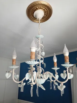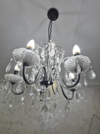 Elegante lámpara de techo de estilo vintage, con un diseño clásico y detalles decorativos. - Estructura de metal en color blanco. - Adornada con cuentas y cristales. - Incluye 5 portalámparas con forma de vela. parador de las hortichuelas(almeria) alguna duda al privado