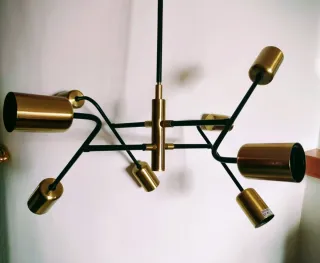 Lámpara de diseño con un estilo moderno y elegante, combinando acabados en negro y dorado. Da un toque muy original a la decoración de cualquier estancia. Va tanto en contexto minimalista como más clásico. - Estructura principal en metal, dorado y negro. - Diseño geométrico y articulado. Está absolutamente impecable, como nueva. Lo