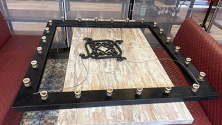 Marco decorativo de hierro forjado con un diseño intrincado en el centro. Ideal para crear un ambiente especial. - Marco negro con detalles dorados. - Diseño central ornamental. - Portalámparas listos para instalar. Hay tres lamparas en total el precio es por unidad Se escuchan ofertas