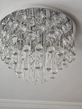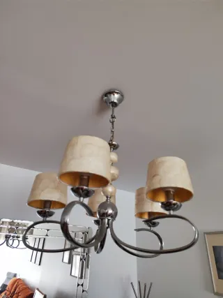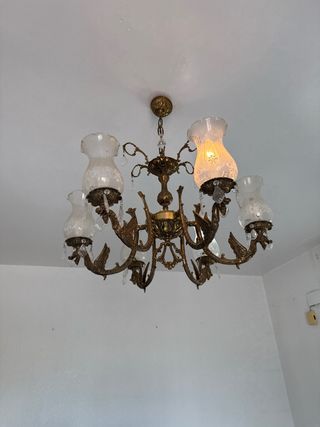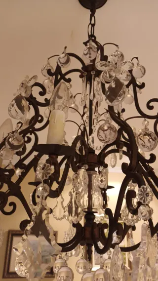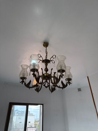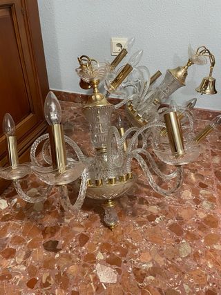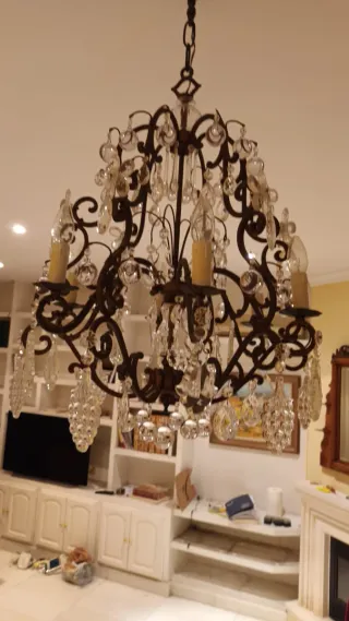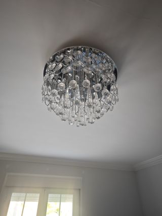Lámpara tipo araña de cristal, aporta mucha personalidad al espacio. En buen estado y funcionando correctamente. Ideal para salón, estudio de belleza o decoración con estilo elegante.