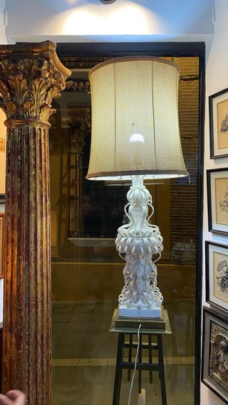 Preciosa lámpara de la famosa localidad alfarera de Manises. Esta pieza destaca por su diseño de pastillaje. Es muy decorativo y elegante, con detalles florales y hojas en alto relieve - Base cuadrada de 21cm cuadrado - 65 cm de alto sin medida con pantalla - Pantalla de tela. - Presenta algunos daños por antigüedad (No se hacen envíos)