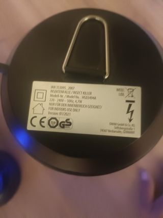 Lámpara eléctrica para eliminar insectos en interiores. Diseñada para uso doméstico. - Modelo: HG03494A - Voltaje: 220-240V - Frecuencia: 50Hz - Potencia: 4,7W - Versión: 01/2021 - Fabricante: OWIM GmbH & Co. KG, Alemania