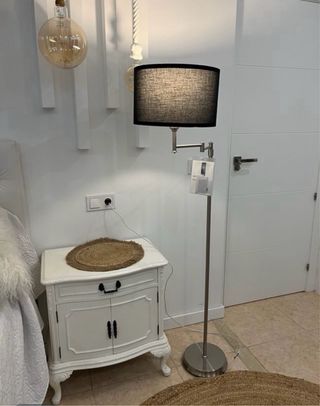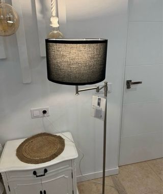 Elegante lámpara de pie con un diseño contemporáneo. Perfecta para añadir un toque de estilo a cualquier rincón. - Pantalla de tela negra. - Estructura metálica plateada. - Bombilla de luz blanca incluida. No es negociable si no te interesa no te molestes sigue mirando lo Mismo encuentras lo que estás buscando