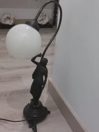 Elegante lámpara de mesa con una base ornamentada y una figura femenina que sostiene la pantalla. - Pantalla esférica de cristal blanco. - Base y estructura de metal con acabado en bronce.