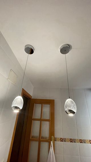 Vendo dos lámparas colgantes ideales para barra de cocina o isla. Diseño moderno y elegante, con pantalla de cristal transparente y detalles metálicos en acabado plateado/cromado. Aportan mucha luminosidad y un toque actual al espacio. • Se venden las dos juntas • En muy buen estado, funcionando perfectamente • Altura regulable • Estilo moderno/minimalista, fáciles de combinar • Ideales para cocina, barra americana o comedor