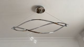Elegante lámpara colgante con un diseño moderno y abstracto. Su acabado brillante le da un toque sofisticado a cualquier espacio. - Estructura de metal. - Color plateado.