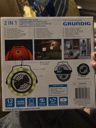 Práctica lámpara y ventilador de camping Grundig. - 12 LED de luz cálida. - 30 horas de funcionamiento. - Ajustable 360°. - Funciona con pilas. - Incluye gancho para colgar.