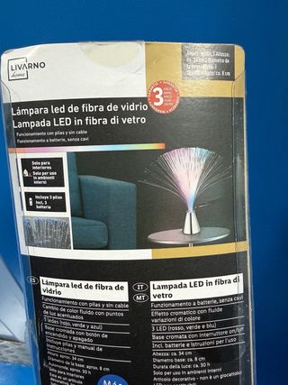 Lámpara decorativa de fibra de vidrio con luz LED. - Funcionamiento con pilas y sin cable. - Cambio de color fluido con puntos de luz. - Incluye 3 pilas. - Base cromada con botón de encendido/apagado. - Altura aproximada: 34 cm. - Diámetro de la base: aprox. 8 cm. - Autonomía: aprox. 30 horas. - Solo para interiores.