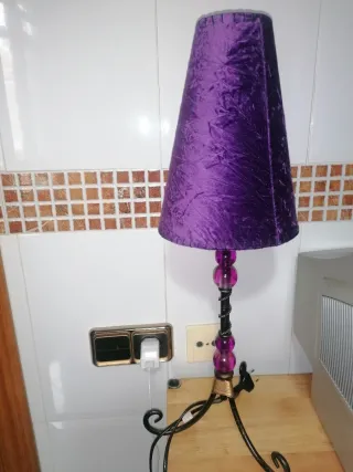 Elegante lámpara de mesa con un diseño único. - Pie metálico con detalles decorativos. - Pantalla cónica de terciopelo en tono morado. - Base dorada.